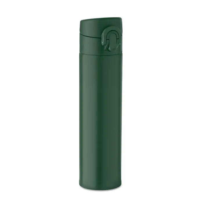 Компактный зеленый термос с двойными стенками из переработанной нержавеющей стали 90% и 10% нержавеющей стали с замком от проливания на крышке и опцией нажатия для открытия.