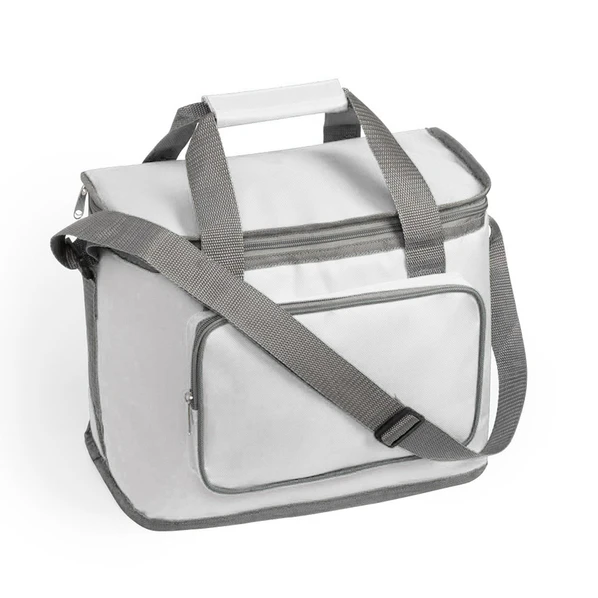 Белая сумка-холодильник из прочного полиэстера 600D с внутренней отделкой из PEVA (термопластик). На ручках предусмотрена вставка из нейлона для усиления прочности.