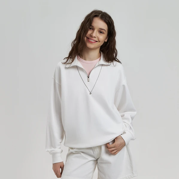 Универсальная белая толстовка с воротником-стойкой и заниженной линией плеча. По нижнему краю и на рукавах — эластичные резинки для комфортной и аккуратной посадки. Модель застегивается на металлическую молнию.