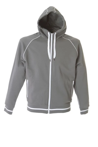 Серая толстовка из полотна "пике" с водоотталкивающей пропиткой. Обратные контрастные молнии для предотвращения попадания влаги внутрь. Рукава-реглан. Декоративная тесьма по горловине спинки.