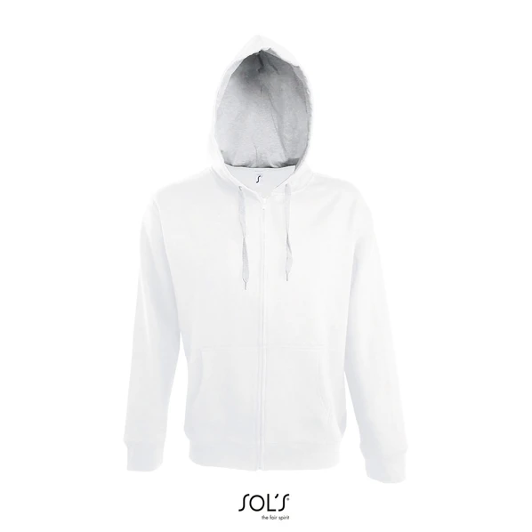 Стильная белая толстовка Soul выполнена из 50% хлопка и 50% полиэстера. Внутренняя сторона из мольтона с начесом, 2 кармана кенгуру, низ изделия и манжеты связаны резинкой из эластана, внутренняя сторона капюшона из мольтона с начесом контрастных цветов, эластичный стягивающий шнур по низу изделия контрастных цветов.