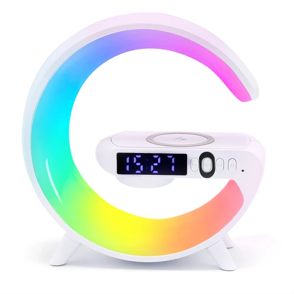 Беспроводная белая колонка Goody с функцией беспроводной зарядки. Часы, будильник, RGB-подсветка, а так же защитная накладка на кнопке включения являются её особенностями.