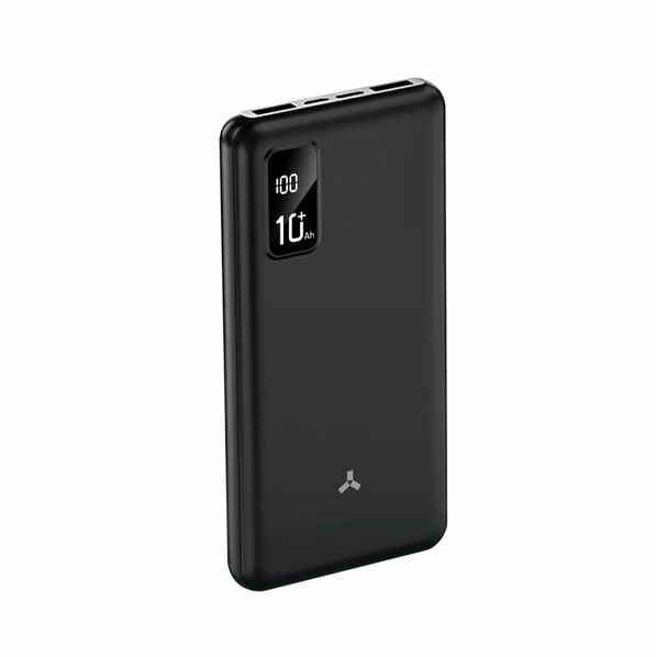 Черный powerbank с дисплеем на 10 000 mAh с QC и возможностью заряжать ноутбуки в компактном пластиковом корпусе.