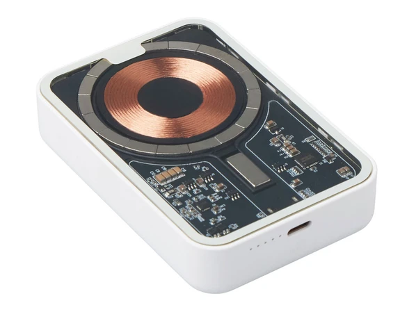 Беспроводной белый магнитный внешний аккумулятор MagnifIQ — технологичный и стильный power bank с эффектной прозрачной передней панелью, сквозь которую видны мощные магниты, индукционная катушка и электронная начинка.