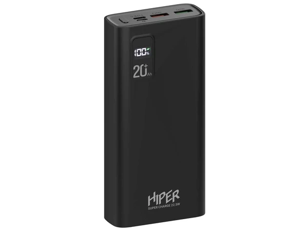 Портативный черный внешний аккумулятор Hiper Fast емкостью 20000 мАч (74Втч). Аккумулятор оснащён двунаправленным портом USB-C, Micro-USB входом для зарядки, с поддержкой быстрой зарядки аккумулятора QC и PD, 2xUSB-A выходами