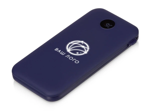 Портативный синий аккумулятор включает в себя всё самое необходимое: стильный дизайн и удобство использования. На фронтальной стороне с цифровым индикатором заряда можно выгравировать яркий светящийся логотип. На обратной стороне с беспроводной зарядкой (5 Вт) для смартфонов можно сделать УФ-лого.