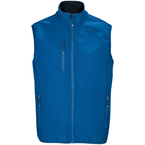 Мужской ярко-синий влагоустойчивый и ветрозащитный жилет из софтшелла с флисовой подкладкой.