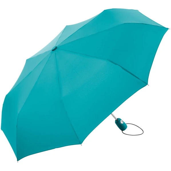 Компактный зонт-автомат бирюзового цвета AOC снабжен системой WindProof, благодаря которой способен выдержать сильные порывы ветра.