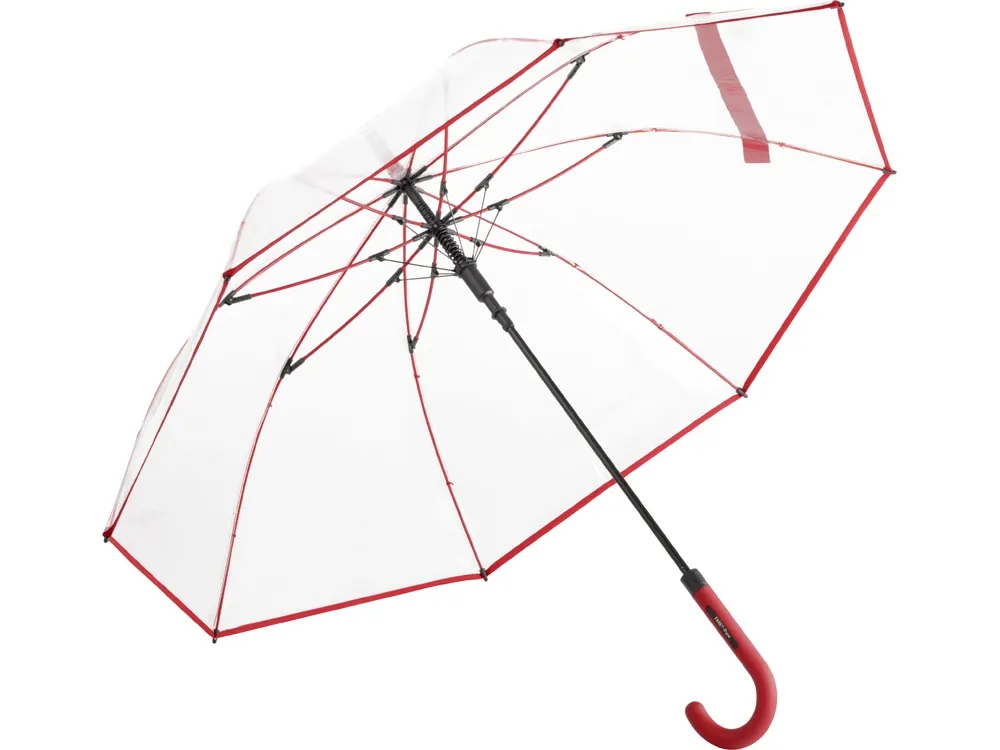 Стильный красный зонт-трость с прозрачным куполом и контрастными деталями легко открывается нажатием кнопки на ручке. Каркас выполнен из прочной долговечной гальванизированной стали. Благодаря гибким спицам из стекловолокна зонту не страшны порывы ветра.